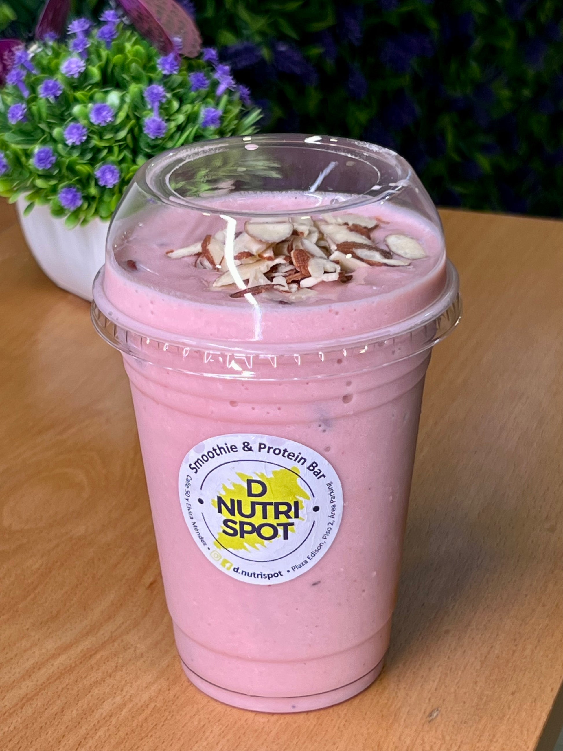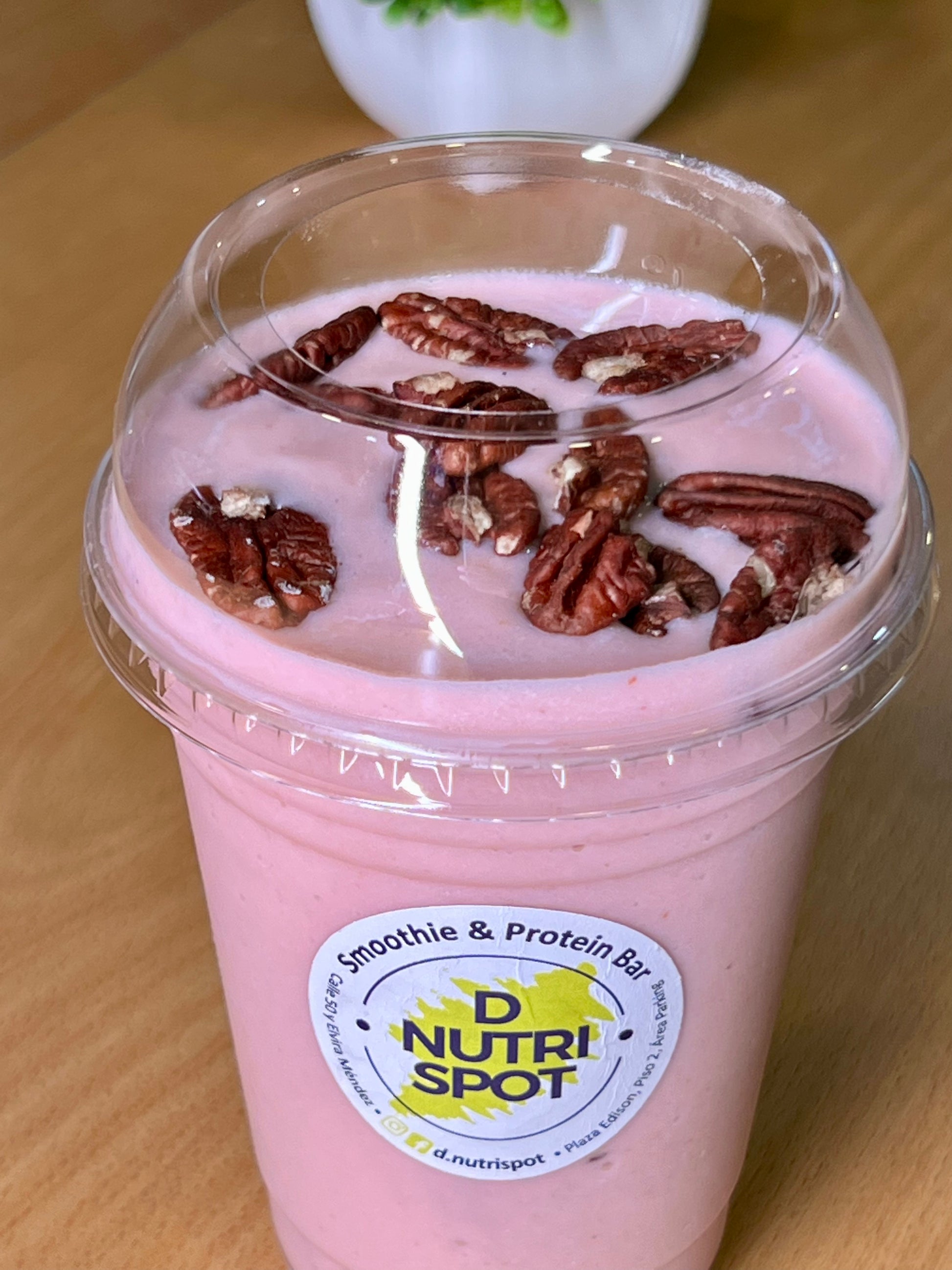 Delicioso batido de proteína preparado con agua, fresas con 1 topping de tu elección.