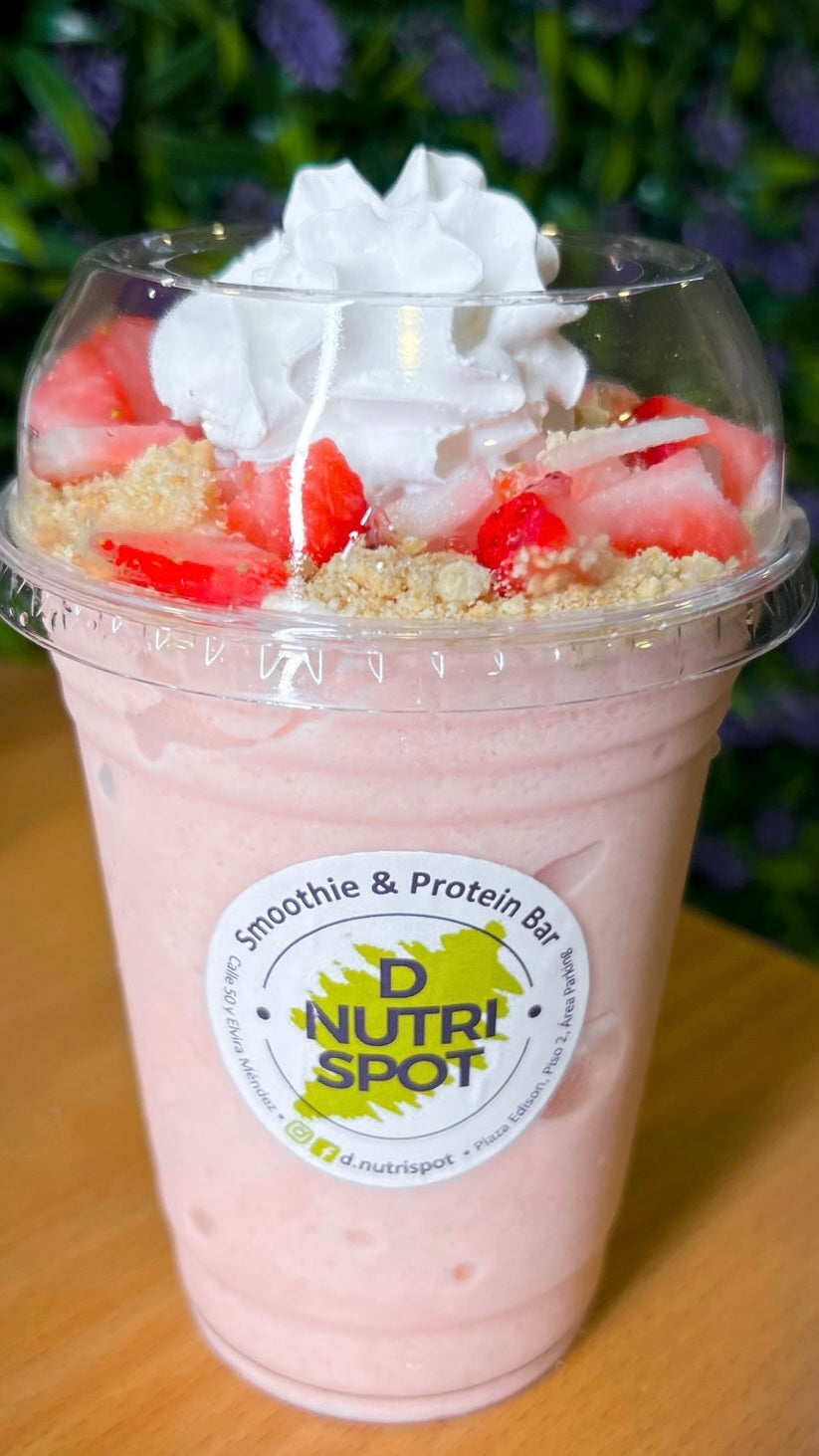 Delicioso batido de fresa con colágeno sin leche bajo en azúcar, carbohidratos , con 28 gramos de proteína y menos de 250 calorías.
